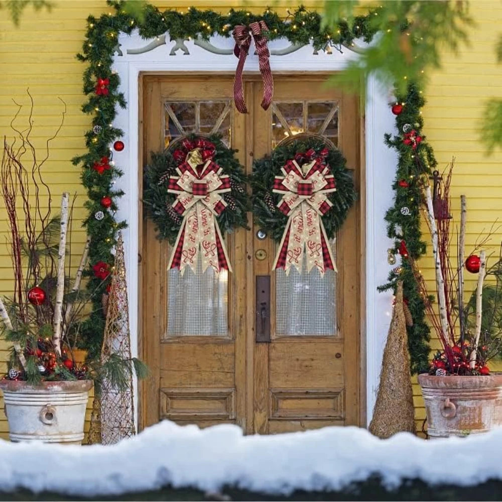 Featuring the timeless red-and-black buffalo plaid with snowflake details and natural burlap ribbons, this bow brings warmth and classic Christmas charm to any space.